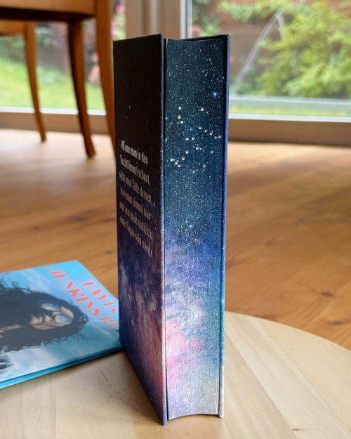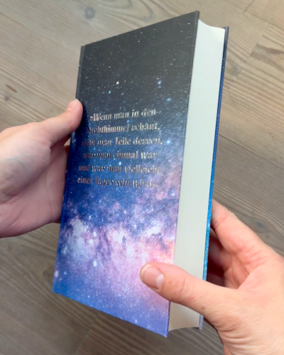 Ehrlicherweise hat es mich etwas gewundert, dass es von Atmosphere keine Ausgabe mit Farbschnitt gibt. Das Buch ist in seiner Standard-Ausführung bereits wunderschön. Ich mag die Gestaltung des Schutzumschlages, aber das Hardcover darunter mit Sternenhimmel und silbern folierter Schrift eben noch viel mehr. Das von mir bemalte Buch ist noch zusätzlich besonders, denn ich hatte das Glück eine Ausgabe mit signiertem Sticker erstehen zu können.