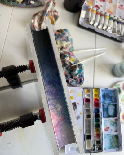 Beim Pressen zwischen Holzbretter, kann ich meine Schraubzwingen ordentlich festziehen. Bei Acrylglas muss das mit mehr Gefühl passieren. Da ich dieses scheinbar einfach nicht habe, reißen mir regelmäßig meine Platten ein. Diese nutze ich dann noch eine Zeit lang weiter und wenn die Risse zu sehr beim Malen stören, gibt es eben neue Zuschnitte aus dem Baumarkt.